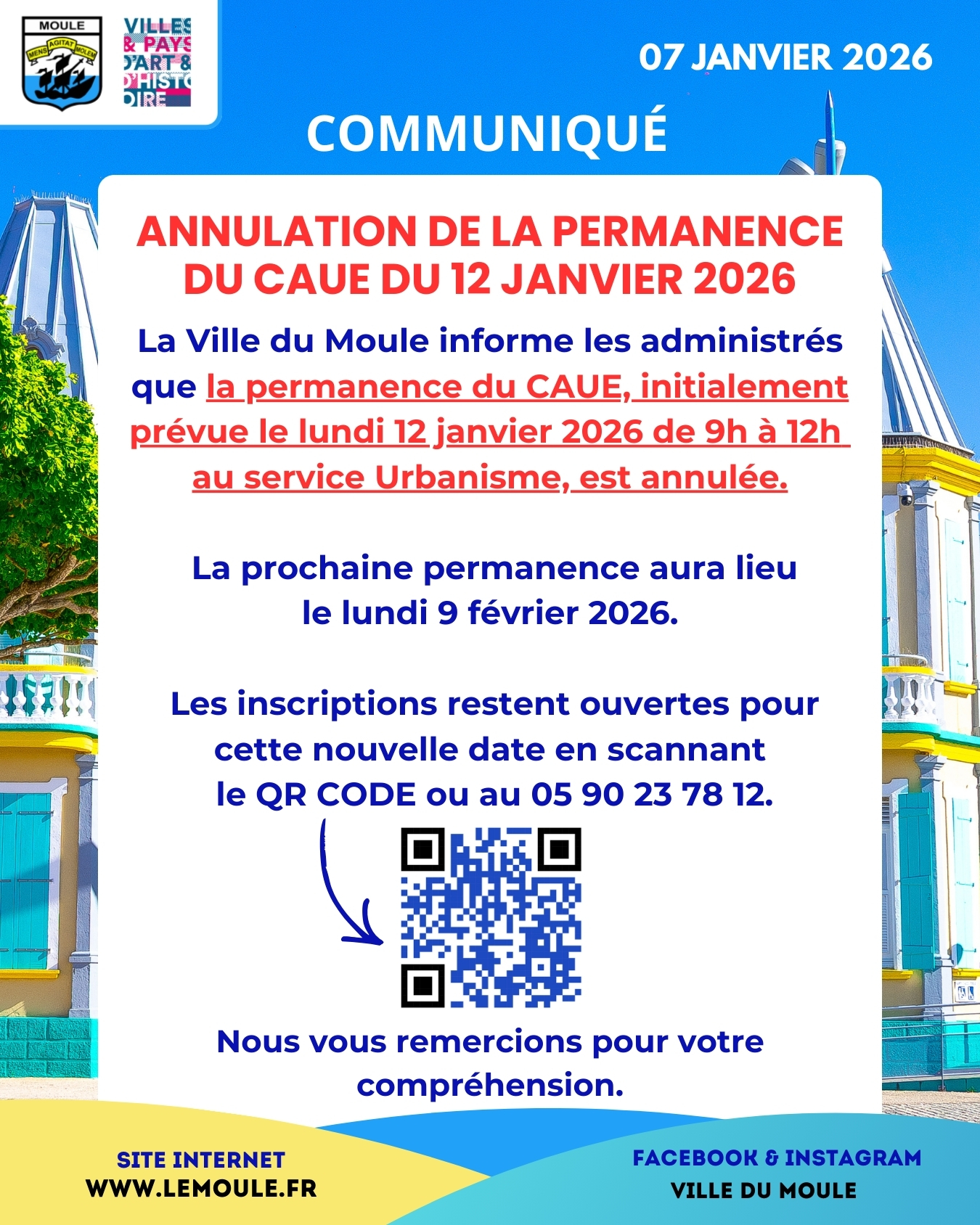 La Ville du Moule informe les administrés que la permanence du CAUE, initialement prévue le lundi 12 janvier 2026 de 9h à 12h au service Urbanisme, est annulée.