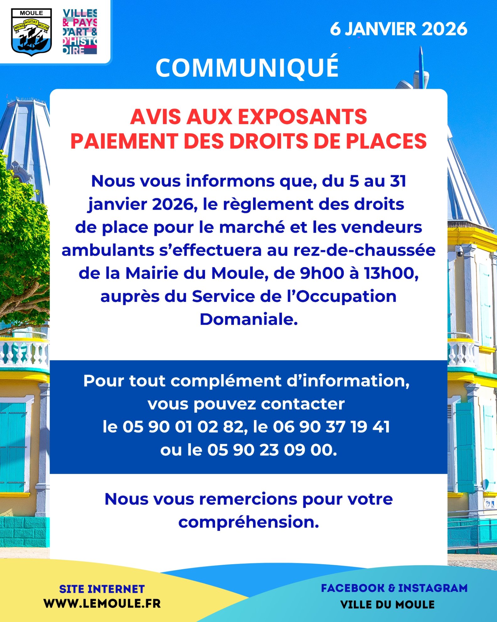 Nous vous informons que, du 5 au 31 janvier 2026, le règlement des droits de place pour le marché et les vendeurs ambulants s’effectuera au rez-de-chaussée de la Mairie du Moule, de 9h00 à 13h00, auprès du Service de l’Occupation Domaniale.