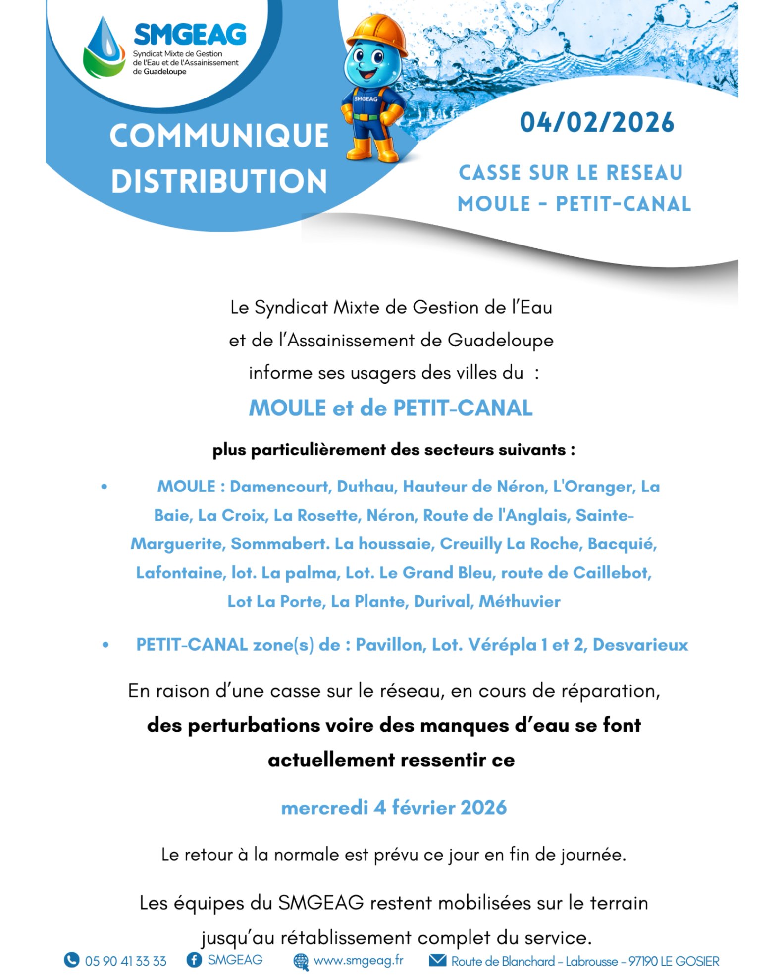 Le SMGEAG informe les usagers de la commune du Moule que des perturbations, voire des coupures d’eau, sont actuellement constatées ce mercredi 4 février 2026, en raison d’une casse sur le réseau d’eau potable en cours de réparation.