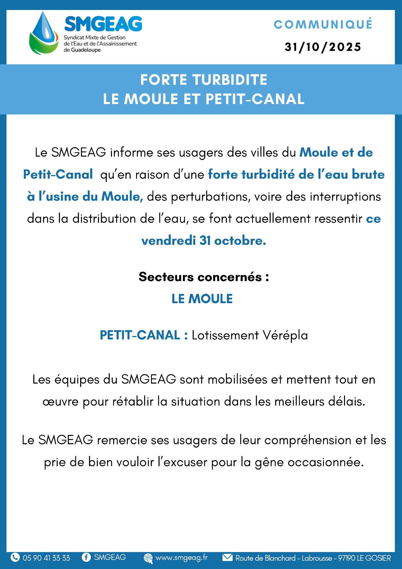 Le SMGEAG informe ses usagers des villes du Moule et de Petit-Canal qu’en raison d’une forte turbidité de l’eau brute à l’usine du Moule, des perturbations, voire des interruptions dans la distribution de l’eau, se font actuellement ressentir ce vendredi 31 octobre.