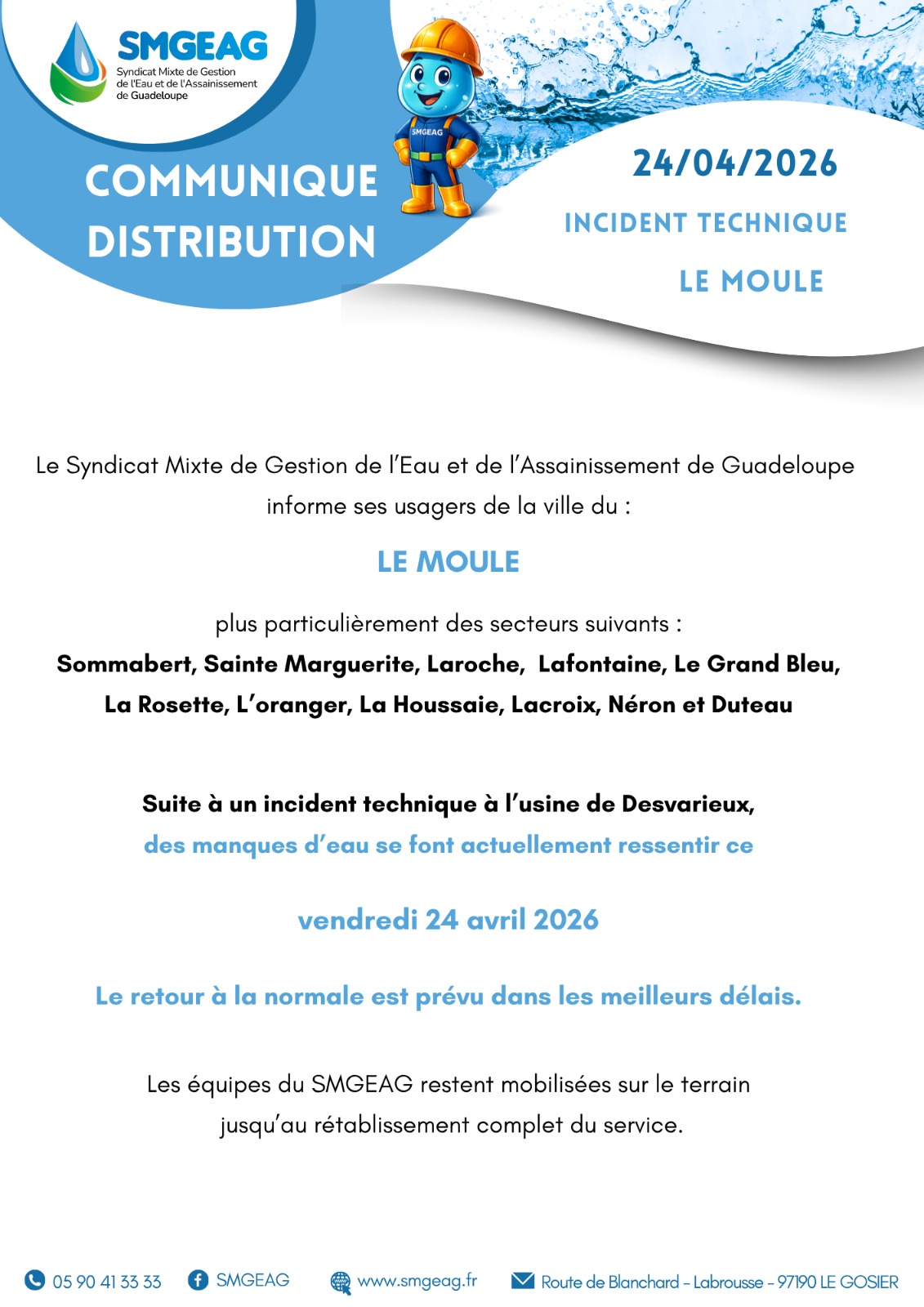 La Ville du Moule informe ses habitants qu’un incident technique survenu à l’usine de Desvarieux perturbe actuellement la distribution d’eau ce vendredi 24 avril 2026.