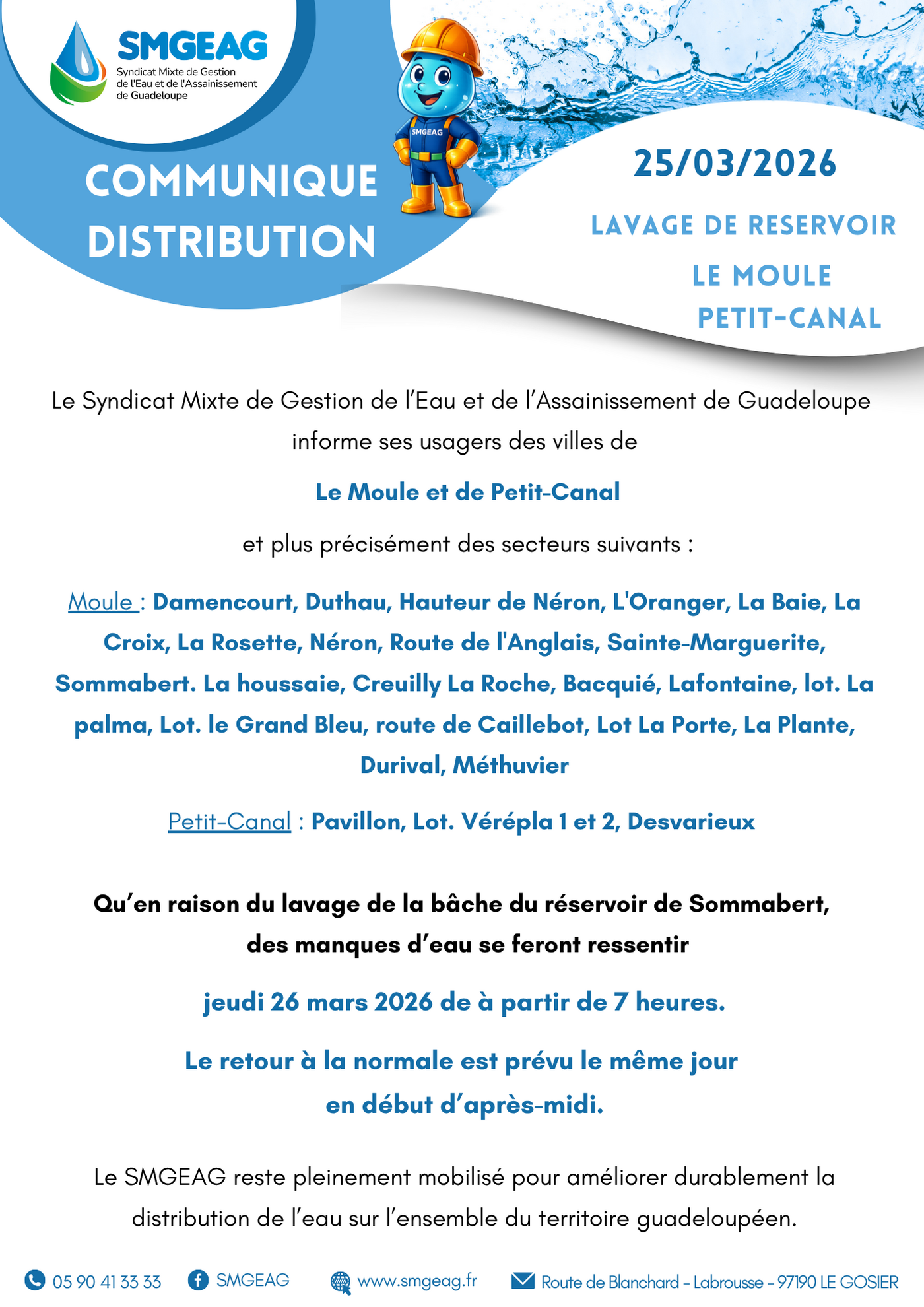 Dans le cadre d’un lavage de réservoir réalisé par le Syndicat Mixte de Gestion de l’Eau et de l’Assainissement de Guadeloupe, des perturbations, pouvant aller jusqu’à des coupures d’eau, sont à prévoir le jeudi 26 mars 2026 à partir de 7 heures.