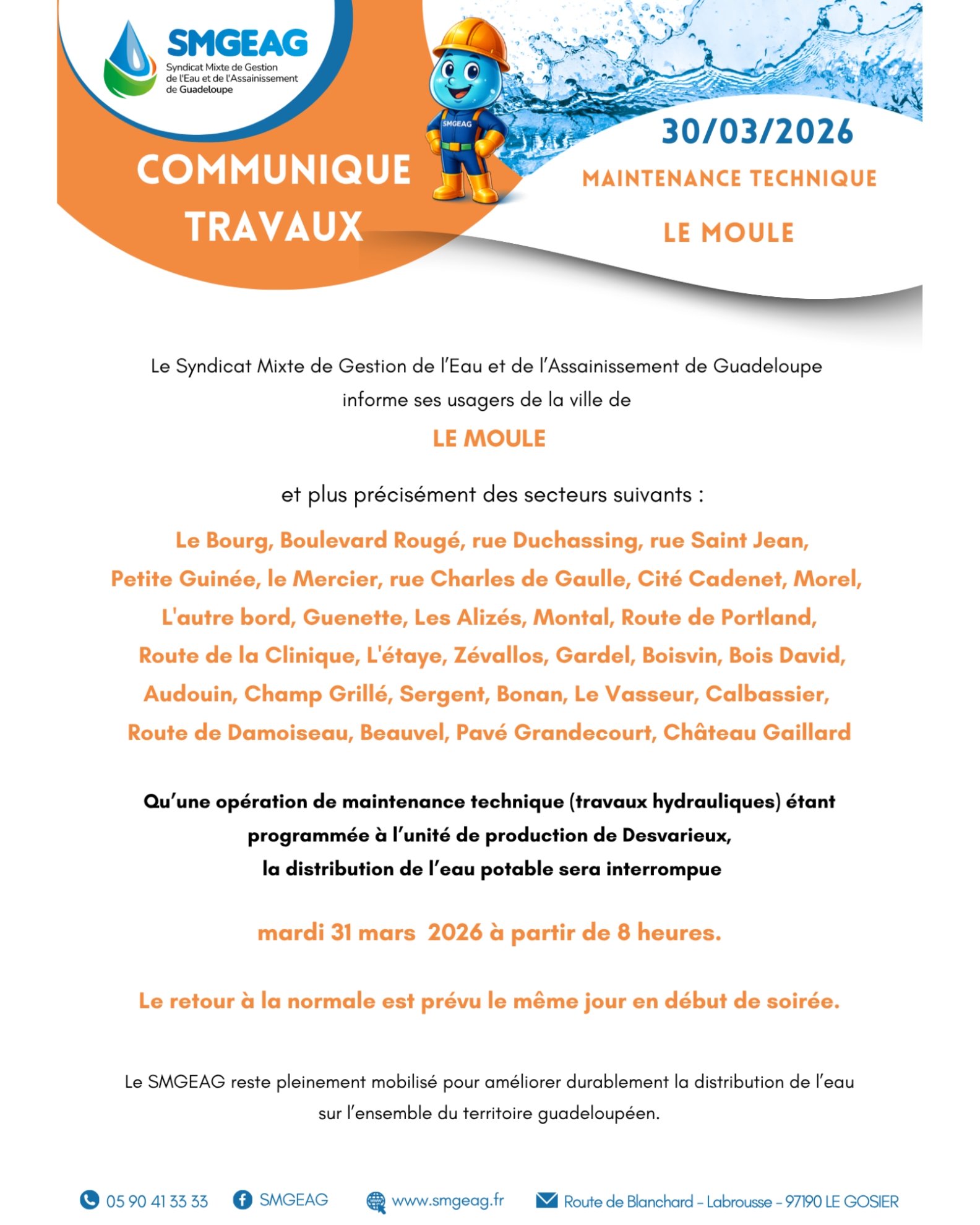 Le Syndicat Mixte de Gestion de l’Eau et de l’Assainissement de Guadeloupe informe ses usagers de la ville de LE MOULE et plus précisément des secteurs suivants :
