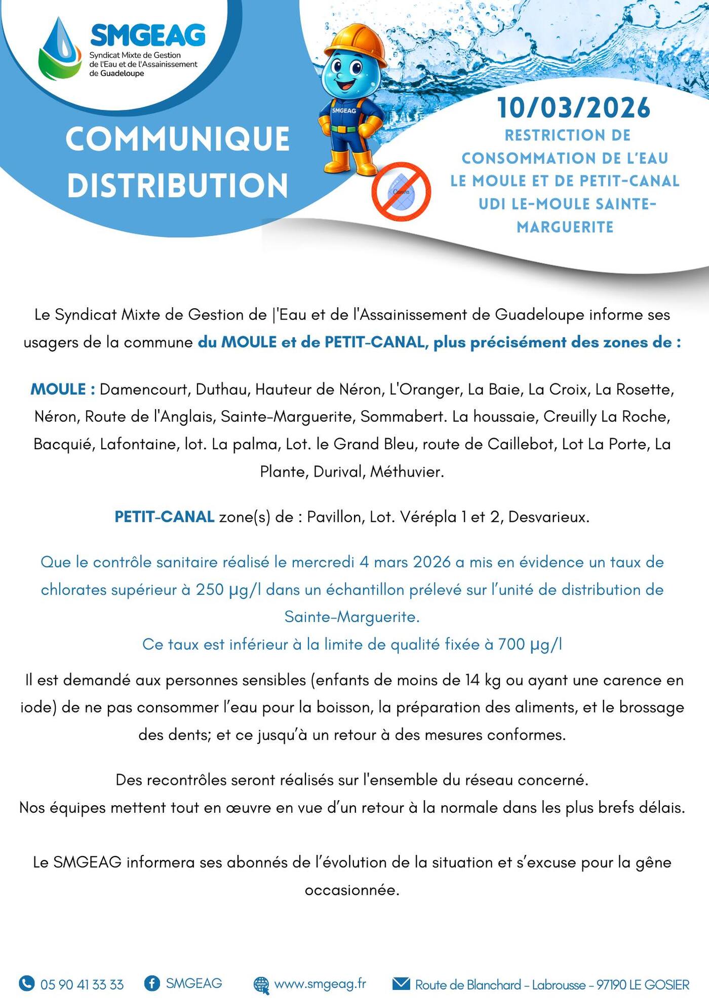 Le SMGEAG informe les habitants de certaines zones du Moule et de Petit-Canal qu’un contrôle sanitaire a révélé un taux de chlorates supérieur à 250 µg/l sur l’unité de distribution de Sainte-Marguerite.