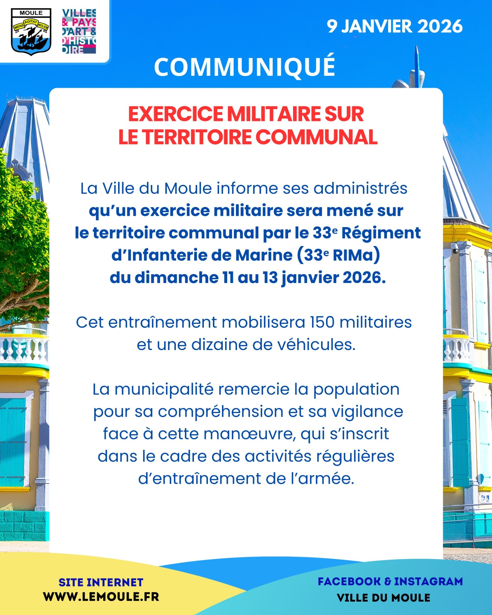 La Ville du Moule informe ses administrés qu’un exercice militaire sera mené sur le territoire communal par le 33ᵉ Régiment d’Infanterie de Marine (33ᵉ RIMa) du dimanche 11 au 13 janvier 2026.