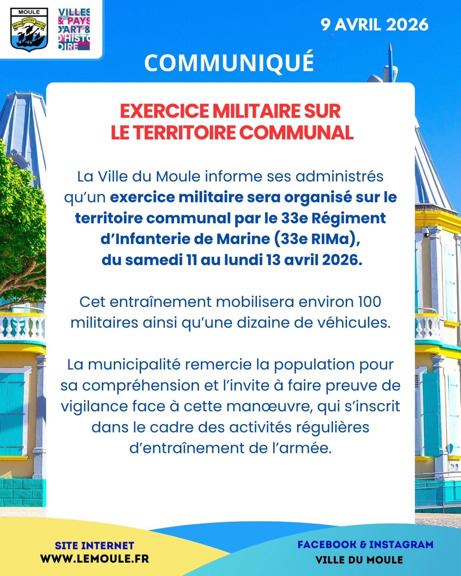 La Ville du Moule informe ses administrés qu’un exercice militaire sera organisé sur le