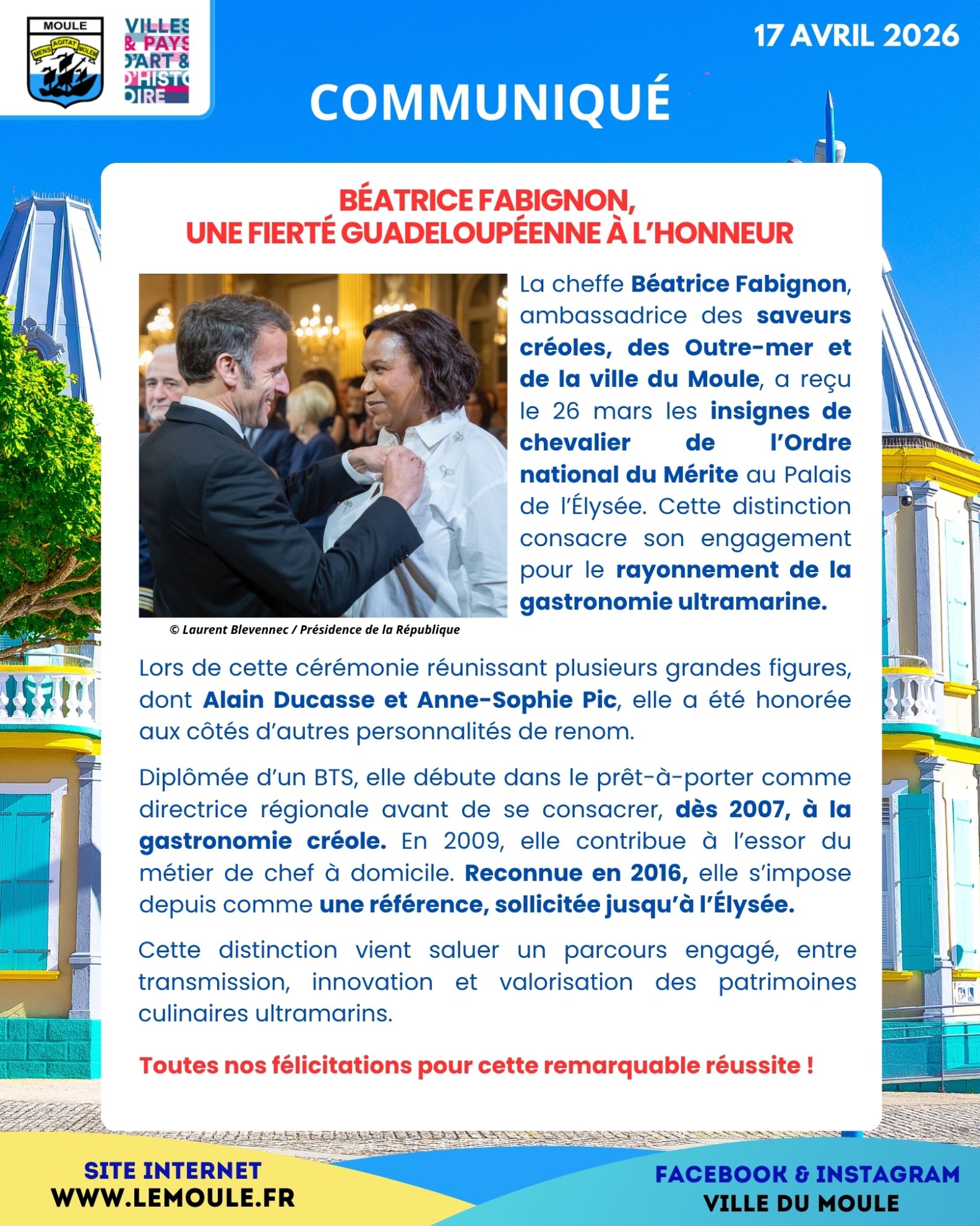 La cheffe Béatrice Fabignon, ambassadrice des saveurs créoles, des Outre-mer et de la ville du Moule, a reçu le 26 mars les insignes de chevalier de l’Ordre national du Mérite au Palais de l’Élysée. Cette distinction consacre son engagement pour le rayonnement de la gastronomie ultramarine.