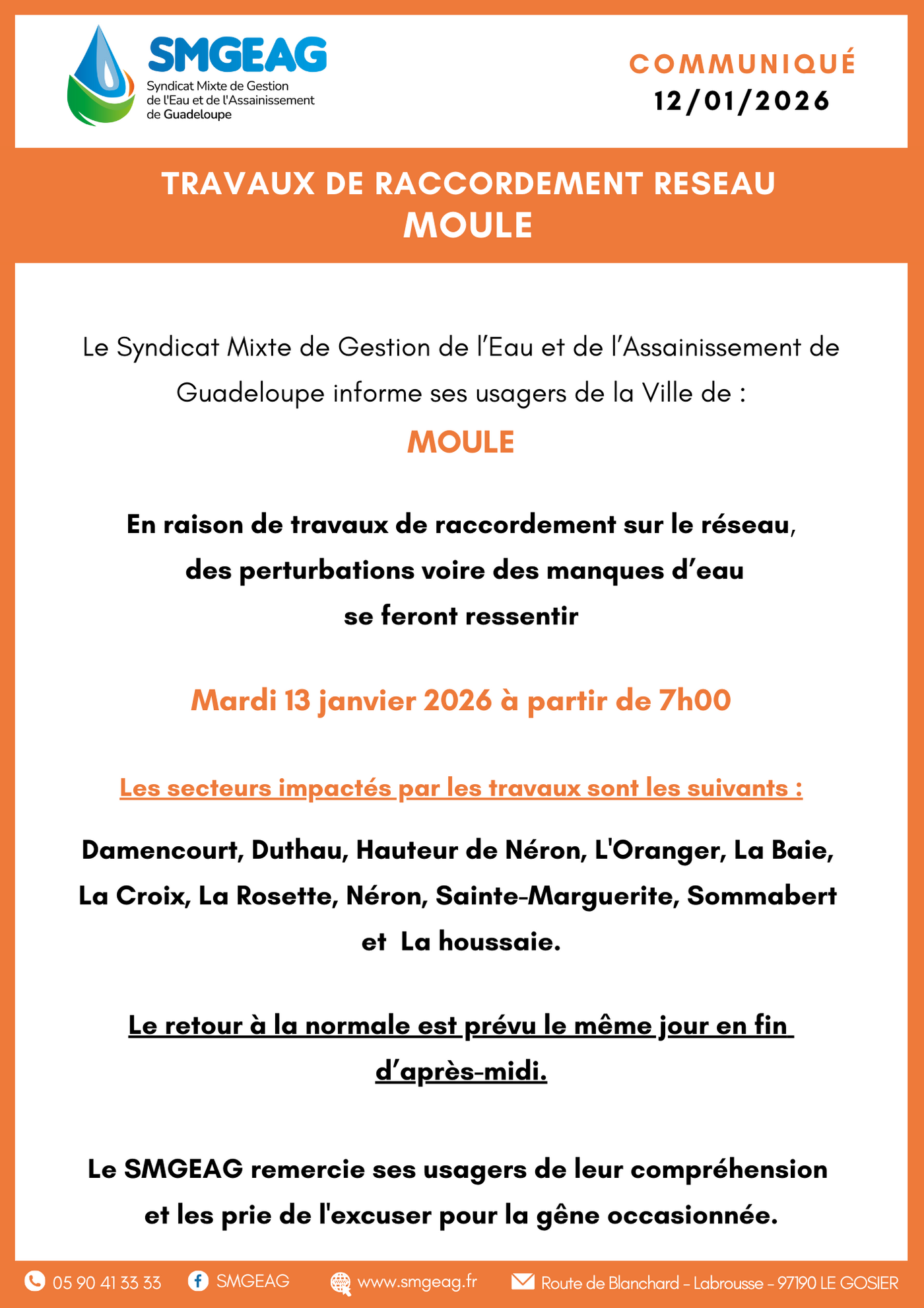 Le Syndicat Mixte de Gestion de l’Eau et de l’Assainissement de Guadeloupe informe ses usagers de la Ville de : 𝐌𝐎𝐔𝐋𝐄