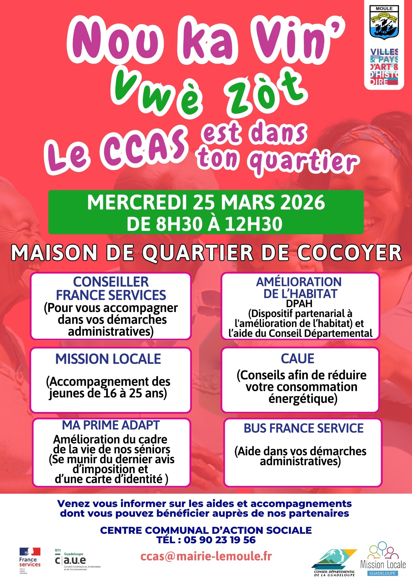 Pour plus d’informations : 0590 23 19 56 - ccas@mairie-lemoule.fr