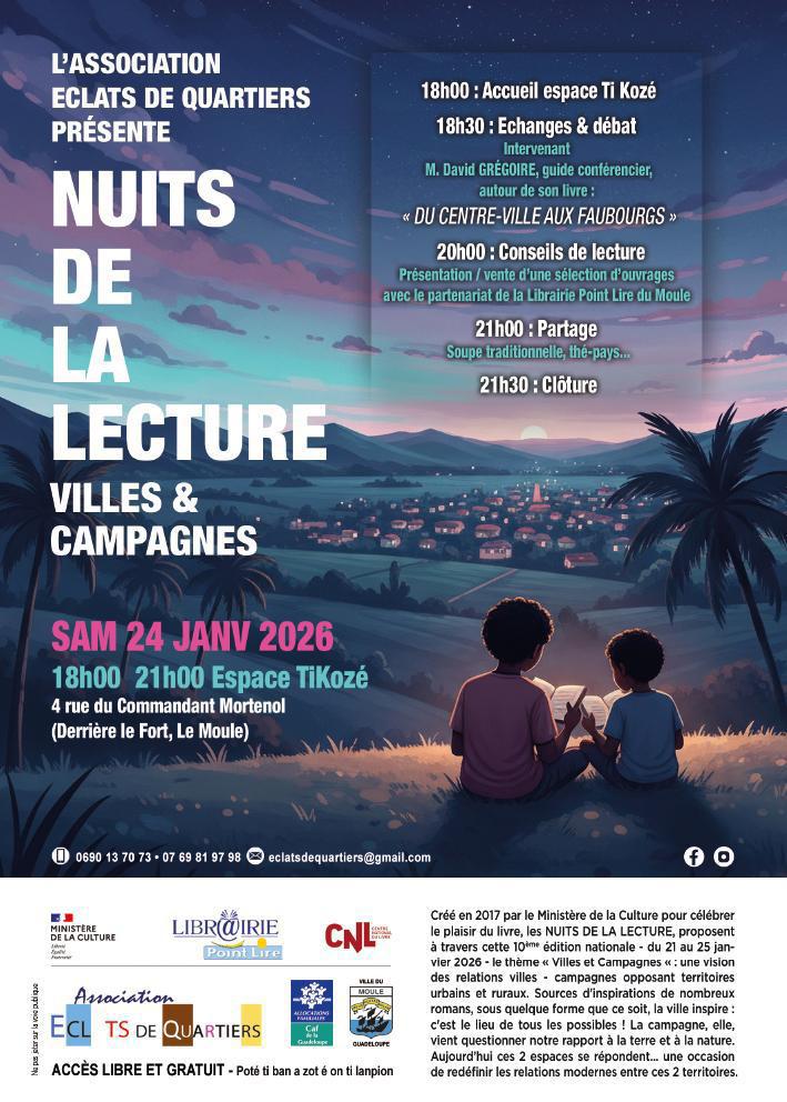 Dans le cadre des Nuits de la Lecture 2026, l’association Éclats de Quartiers organise l’événement « Nuits de la lecture – Villes & Campagnes » à l’Espace Ti Kozé au Moule.